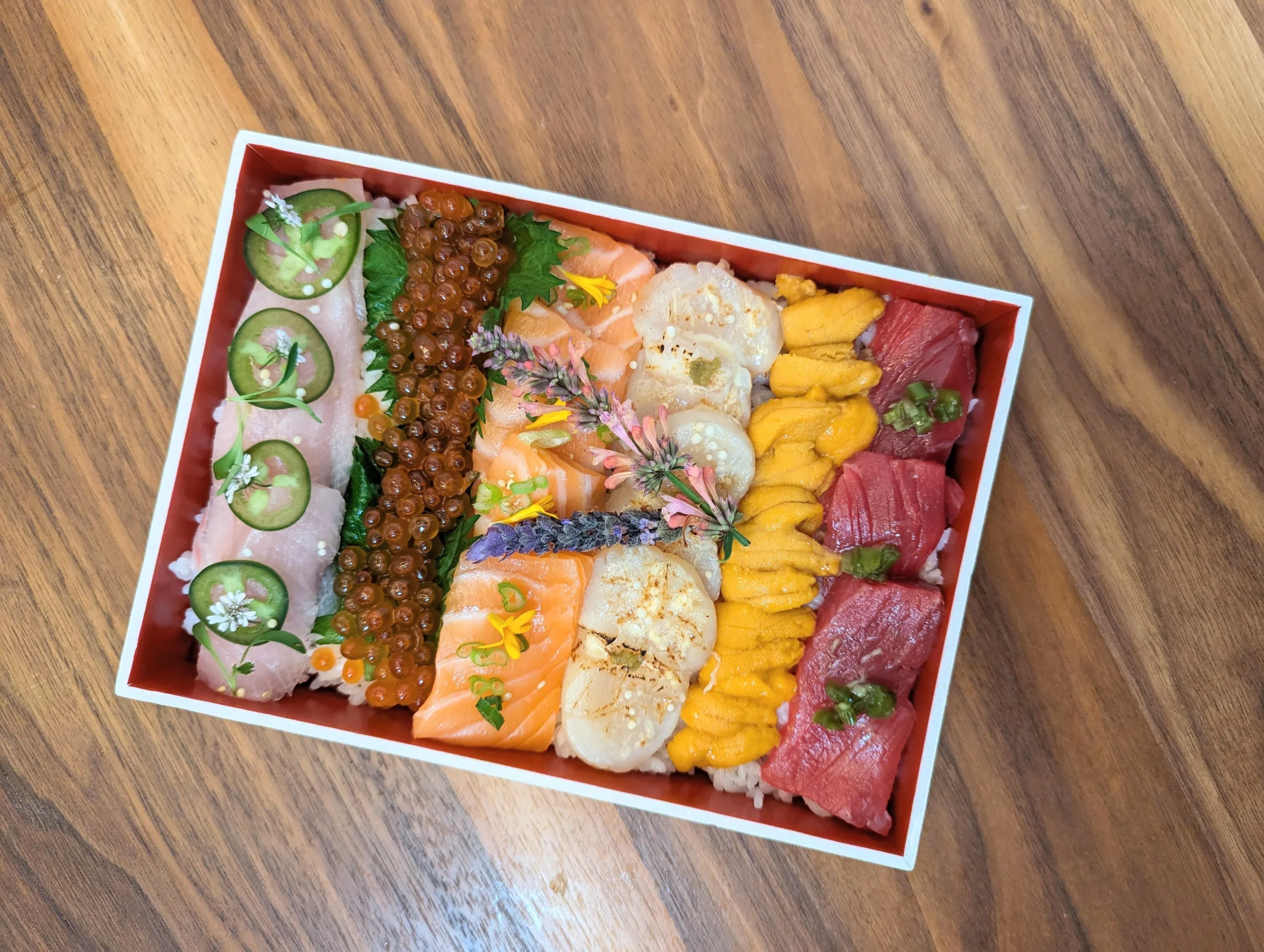 寿司を木製の半切箱に盛り付けるには、バランスの取れた色彩を保ちながら、食材をランダムに並べるという芸術的なアプローチが必要です。ただすべてを混ぜ合わせるのではなく、すべての魚が見え、最初に食べたくなるような構成を作る必要があります。盛り付けは、ご飯の上に隙間なく小さな庭を作るようなイメージです。